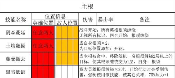 3、藤蔓撤去:当主体受到攻击命中后(无论伤害),随机移除一名根须在2层以上的目标,使其根须变为1层(提前行动),并为自己增加1层标记。