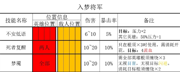 3、梦魇:当我方所有影响根须*3,那么将军将对我方全体角色造成较高伤害,无视目盲和闪避,然后消耗目标2层根须。