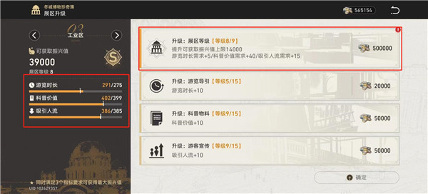 在展区升级的界面,我们可以选择升级对应的属性来提升展区属性值,1次升级提升10点,并且下一次升级的花费会更高。这个是提升展区评价的次要手段。