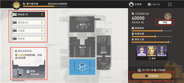 3、具体收益需要看展区的等级和评级。升级可以通过点击经营界面右上角的升级按钮来升级展区,评级主要看左侧,一共有C、B、A、S四个等级,评价越高获得的经营收益越高。经营过程中如果左下角出现额外经营目标,都要及时做,能够得到展品线索和解锁助手。