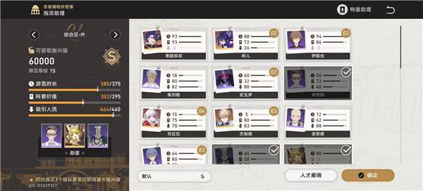 每个助手都有三条属性,对应他们擅长的地方。我们需要根据助手的特点来选择他们适合的展区,人尽其用,尽可能保证展区的评级达标。