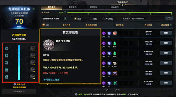 完成每日/每周委托时可获得点数,获得一定的点数时可以领取艾芙娜信物。在大城市的金币商人处能够通过这个道具兑换成金币,保底差不多200金,还能开出价值100和1000金的金块。