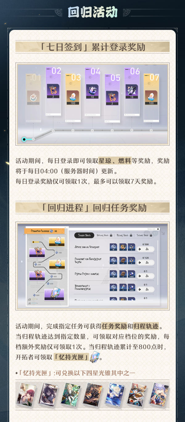 2、活动期间,完成指定任务可获得任务奖励和归程轨迹。当归程轨迹达到指定数量,可领取对应档位的奖励,每档额外奖励仅可领取1次。当归程轨迹累计至800点时,开拓者可领取“忆持光匣”。忆持光匣可在四星光锥池中选择兑换任意一个。星琼奖励总共合计500左右。