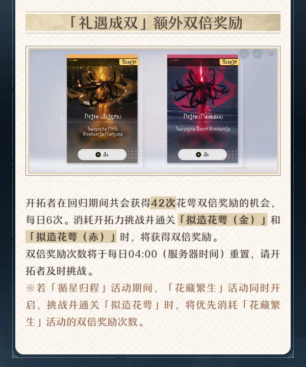 3、开拓者在回归期间共会获得42次花萼双倍奖励的机会,每日6次。消耗开拓力挑战并通关「拟造花萼(金)」和「拟造花萼(赤)」时,将获得双倍奖励。