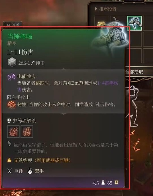 4、当锤棒喝能给于敌人施加2d6-1的钝击伤害,在跳跃时会造成1-4伤害。