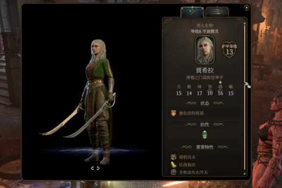 2、博德之门3中的贾希拉是高阶竖琴手,同是也是半高精灵,她拥有德鲁伊和战士两种职业,我们可以与其互动招募她加入队伍。