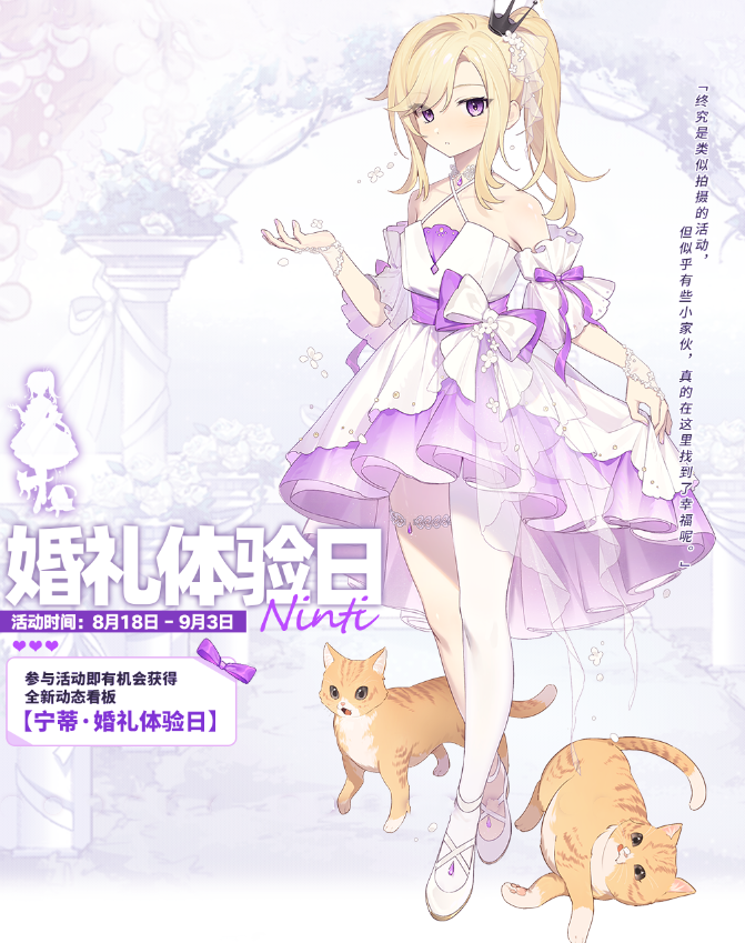 8月18日12:00~9月3日24:00,玩家通过参与活动【婚礼体验日】获取积分,即可在积分奖励中获取全新看板宁蒂·婚礼体验日。