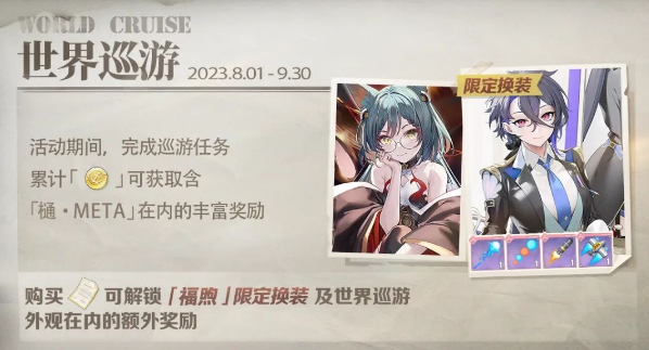 最新一期「世界巡游」的活动为8月1日 00:00 ~ 9月30日23:59,当指挥官的巡游达到指定进度时,指挥官可以直接免费领取包含樋·META、特装型布里MKIII等奖励在内的基础巡游奖。