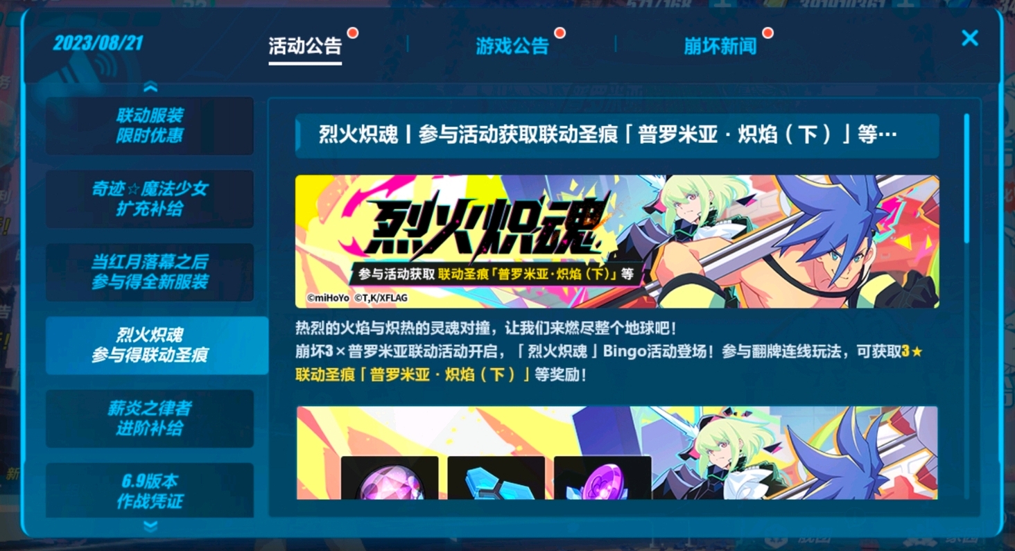 6.9版本期间,玩家只需参与「烈火炽魂」Bingo面板活动就能免费获取本次的联动圣痕啦!免费喔!