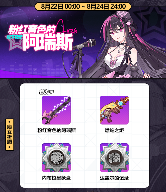 本期魔女祈愿还是全新装备粉红音色的阿瑞斯的首次UP!喜欢的小伙伴不要错过啦~