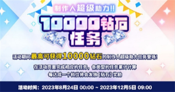 活动期间,制作人在活动页面完成相应的任务,各类型的任务累计计算,每达成一个档位将会发放【钻石】奖励,活动期间最高可获得【钻石*10000】。