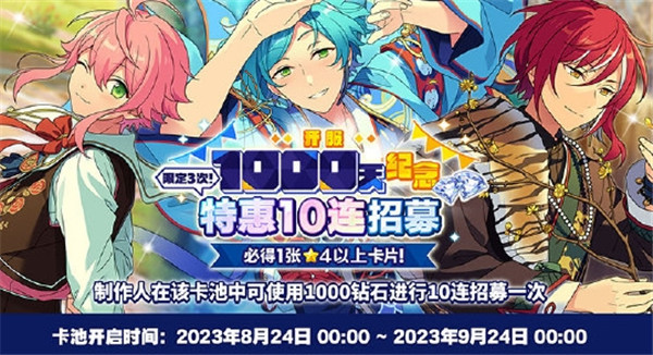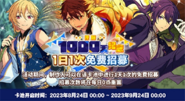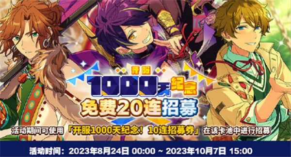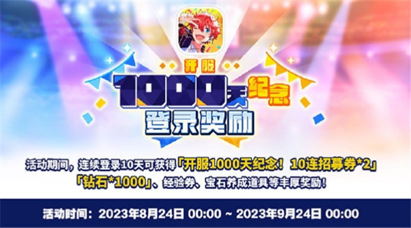 8月24日,游戏《偶像梦幻祭2》迎来开服1000天,为感谢各位制作人一直以来的支持和喜爱,游戏内将上线1000天相关纪念活动!相信一直陪伴《偶像梦幻祭2》走来的制作人们都非常关注1000天纪念活动吧,很多制作人问会不会送免费的十连抽呢?小编已经为大家整理好最新的1000天纪念情报了,本次福利不止十连抽喔!