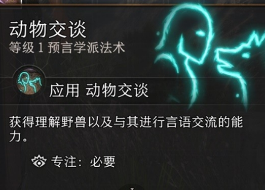 3、这个时候我们就需要游戏中的法术---动物交谈此时,他可以让我们听懂动物的话从而交流,要是没有这个法术的话,可以等后面获得之后传送回来继续。