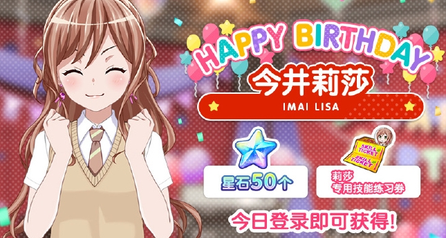 赠礼包含【星石*50】、【莉莎专用技能纪念券*1】,游戏内还会开启莉莎的生日特别剧情,记得阅读领取礼物喔!