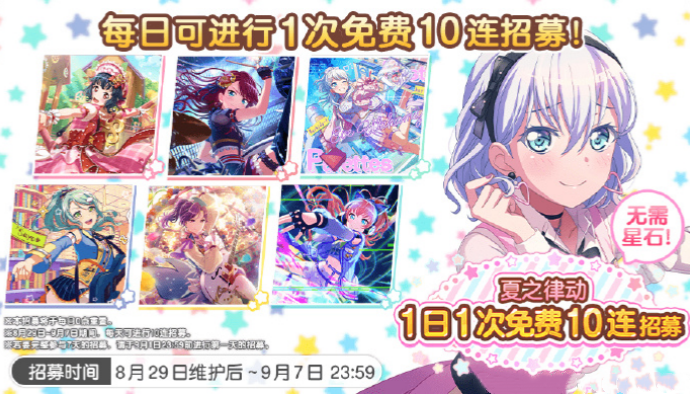 BanGDream游戏除了即将开启限时累计消费活动外,还将开启免费十连抽活动喔!相信大家看到“免费十连”都心急难耐了吧!本次「夏之律动·后章」的免费十连抽活动还是1日1次免费的!好啦,相信大家都非常激动地想知道本次1日1免费十连抽活动的情报了,小编已经帮大家整理好最新的活动信息了,快来看看吧!