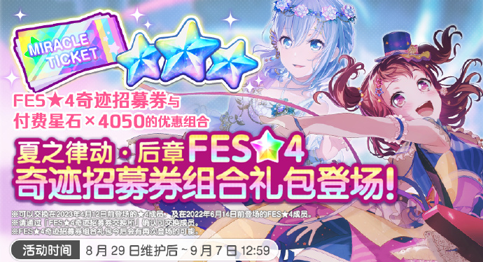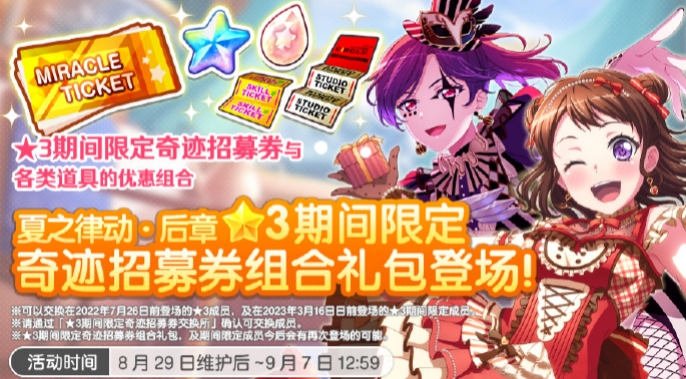 BanGDream夏之律动纪念活动正在火热开展中!8月29日起,游戏内也将要开启本次夏之律动纪念活动的充值优惠活动啦!根据的官方的消息,游戏里不仅上线充值优惠,还有「★3期间限定奇迹招募礼包」&「FES★4奇迹招募礼包」同步上线喔!相信小伙伴们都守着钱包等着这次的充值优惠活动了吧,小编已经为大家整理好活动将要上线的礼包信息啦,快来看看吧!