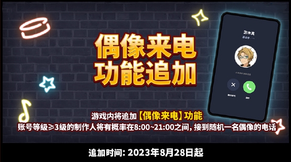 活动详情:【偶像来电】将在8月28日追加,各位账号等级≥3级的制作人将有概率在8:00~21:00之间,接到随机一名偶像的电话~