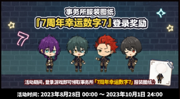 活动期间,制作人登录游戏就能领取事务所「7周年幸运数字7」服装图纸啦。