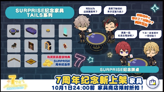 其中,「SURPRISE 7周年纪念牌桌」还附带限定动作和互动功能,制作人购买家具套装还将获得特典家具「SURPRISE纪念币」!
