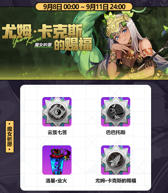魔女祈愿卡池9月8日将进行新一波轮替,尤姆卡克斯的赐福获得UP机会啦~小伙伴们在本次魔女祈愿中抽取到的装备都是等级为50的装备;