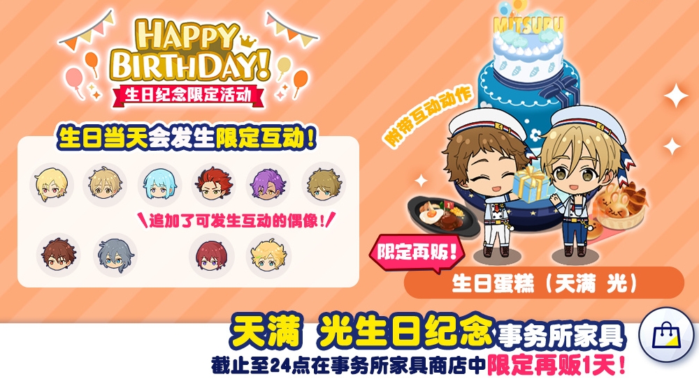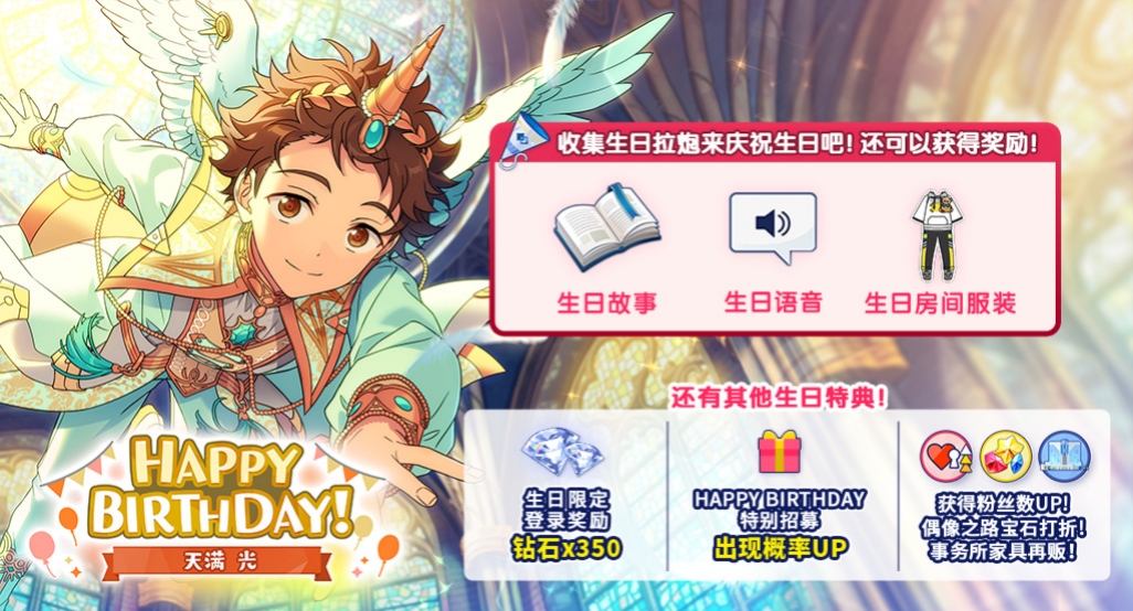 9月7日是《偶像梦幻祭2》偶像天满光的生日喔!相信各位制作人都想知道天满光生日的时候官方会放出什么样的福利了吧!按照往常的惯例,游戏内一定会有生日派对的,制作人们不要忘记登陆游戏为天满光庆祝生日啦,小编也帮大家整理好本次光君的生日福利啦,一起来看看吧!