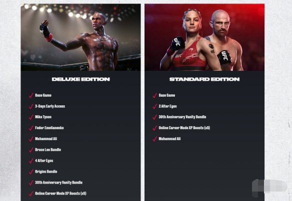 EA宣布格斗游戏《EA Sports UFC 5》将于2023年10月27日发售,登陆PS5、XSX|S,标准版69.99美元,豪华版99.99美元,购买豪华版可提前3天进入游戏。预购奖励、标准版、豪华版的详细内容如下: