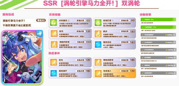 双涡轮的SSR协助卡将在9月12日12:00正式上线,训练员们赶紧来看看这种协助卡的具体数据吧!
