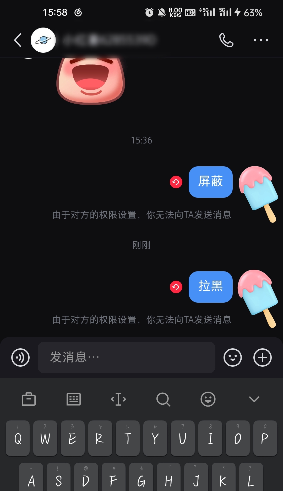 1、被对方拉黑后,我们将无法给对方发送消息,此时发送消息聊天界面会提示“由于对方的权限设置,你无法向TA发送消息”。