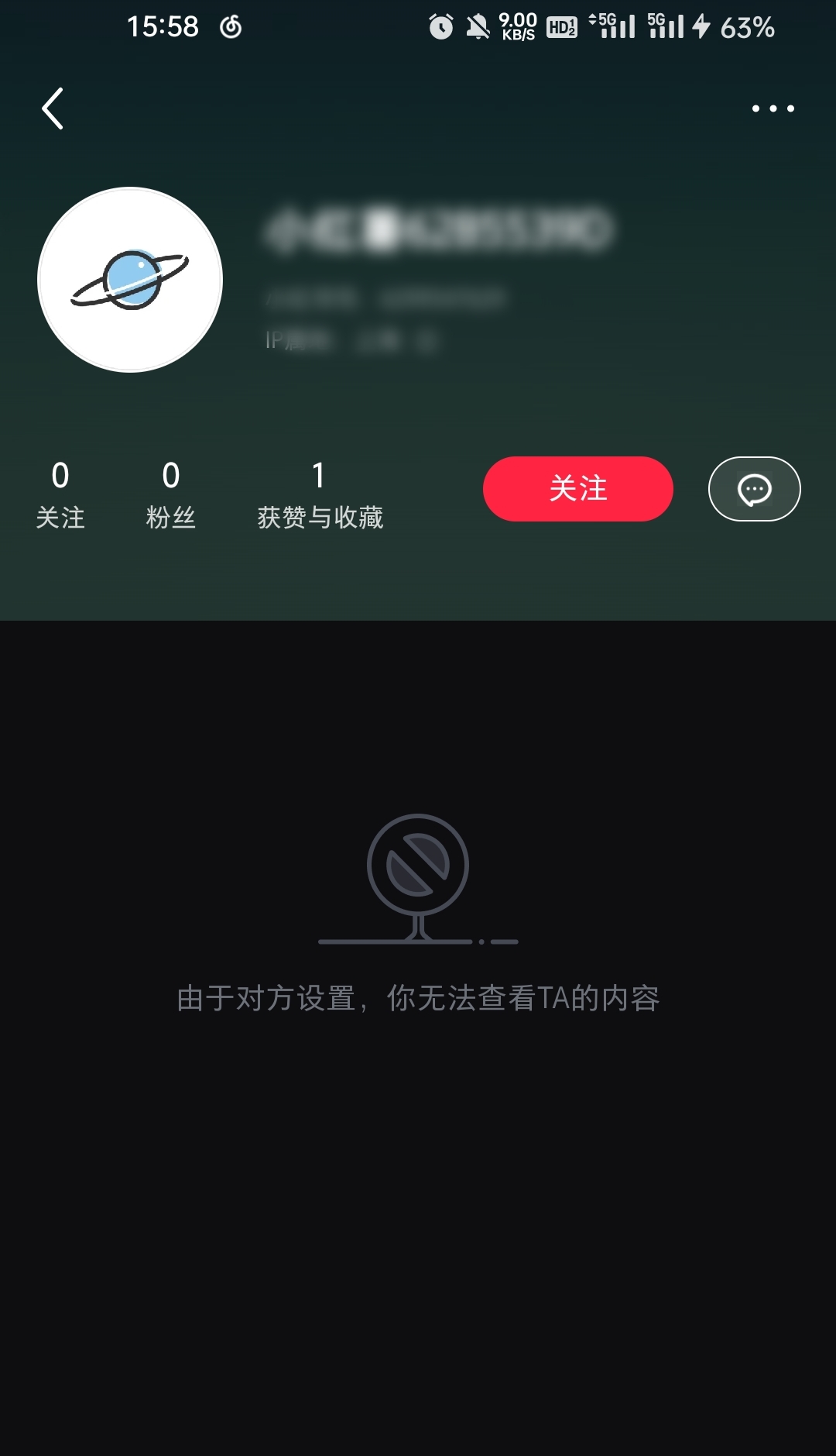 2、被对方拉黑后,我们点开对方的主页是无法查看对方的笔记的。