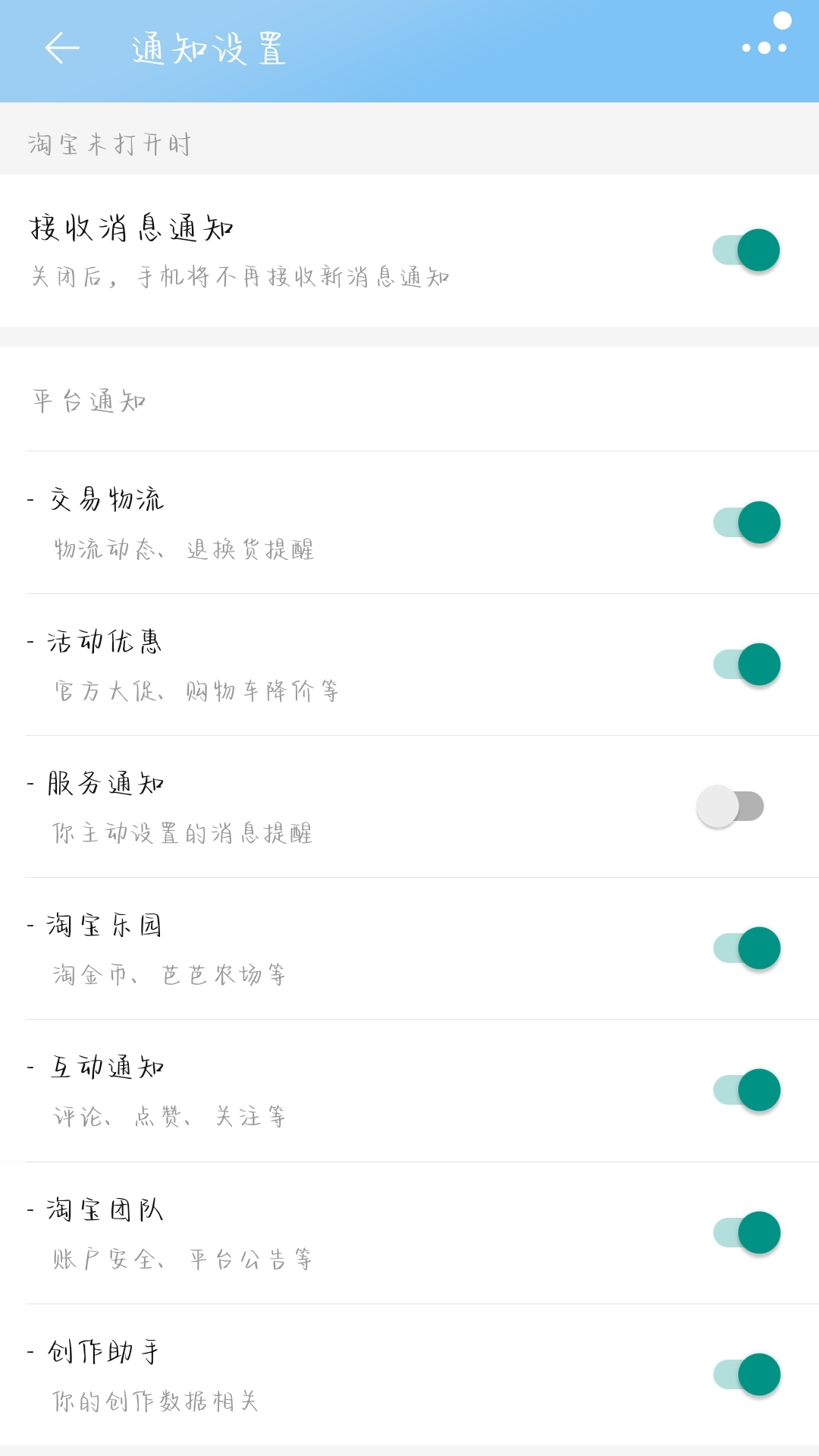 淘宝时不时会给我们发很多推送,其中不乏有物流通知、活动优惠、淘宝乐园的通知,不过,淘宝的通知还是太多了,大家还是想关闭一些甚至是完全关闭平台通知,小编这一期就教大家怎么关闭平台通知吧,希望喜欢安静少消息的小伙伴不用受消息的打扰。