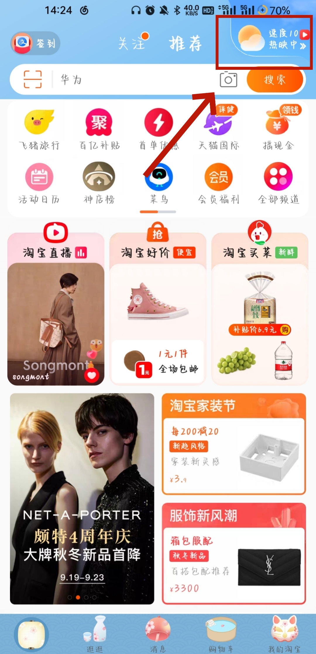 1、淘宝短视频的入口非常好找!我们来到【首页】直接点击右上角。