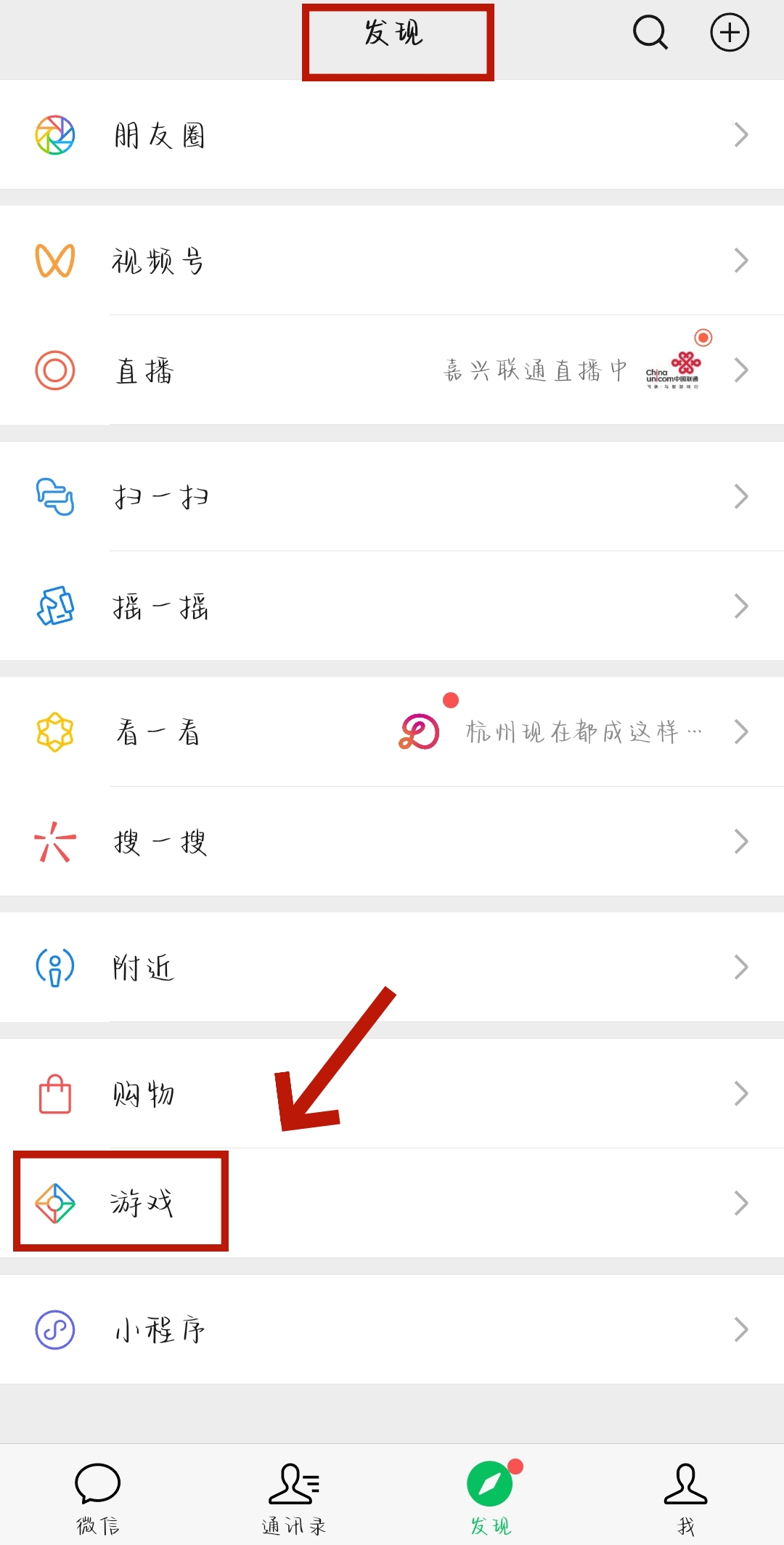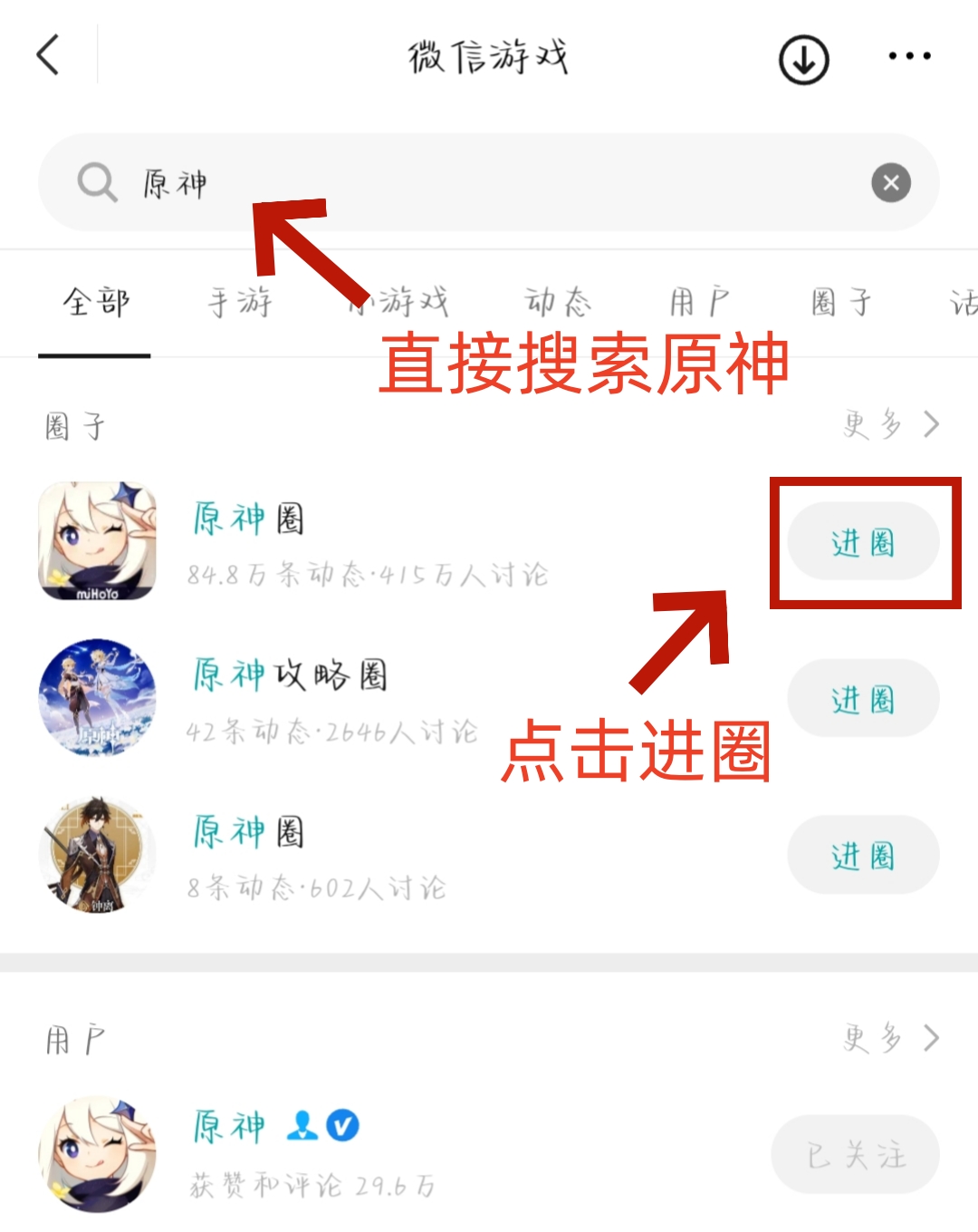 ① 旅行者打开微信,直接在导航栏【发现】-【游戏】中搜索“原神”,进入原神圈。