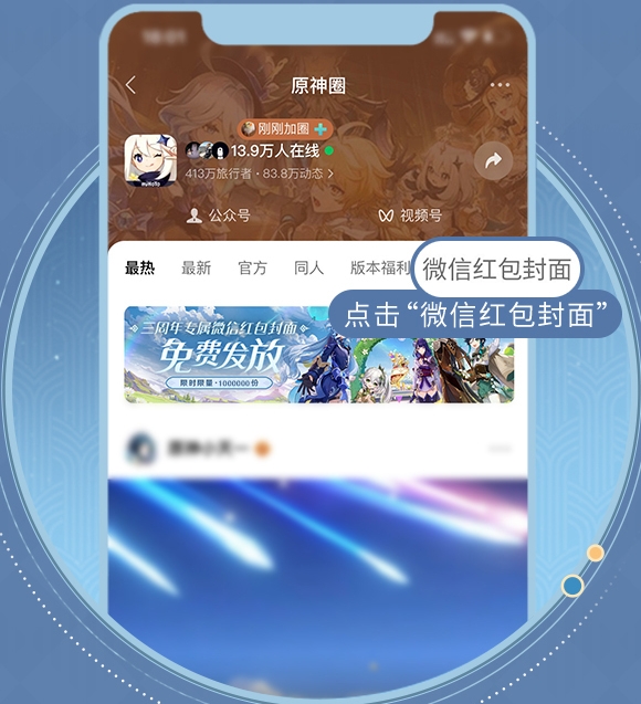 ② 进入原神圈后,旅行者在9月28日后点击首页导航栏中的【微信红包封面】就能进入领取页面了。