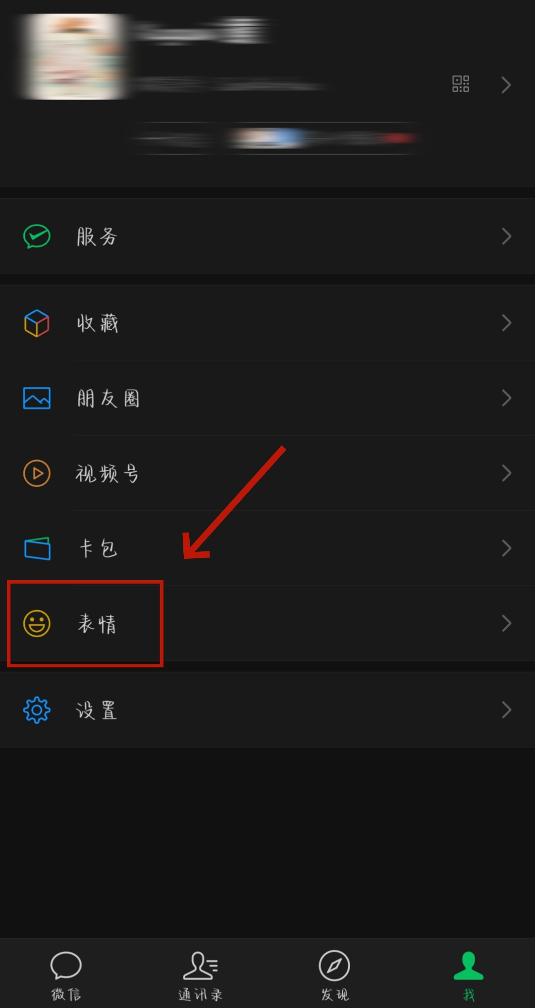 1、首先我们来到微信【我的】,点击【表情】。