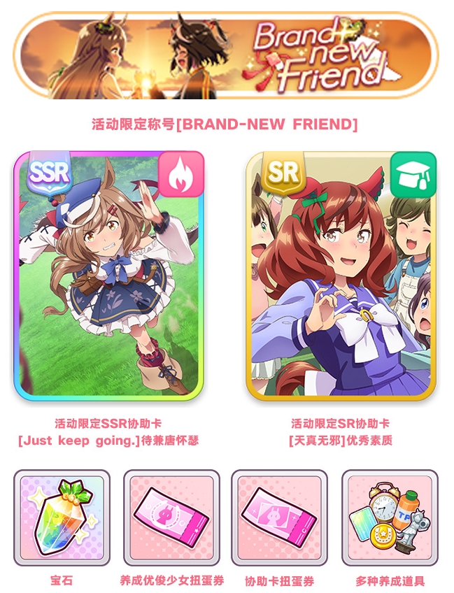 以下角色和协助卡都在本次【Brand-new friend】剧情活动中有特别加成,训练员可以养成以下优俊少女或将协助卡编入自己的协助卡卡组获得额外积分奖励。