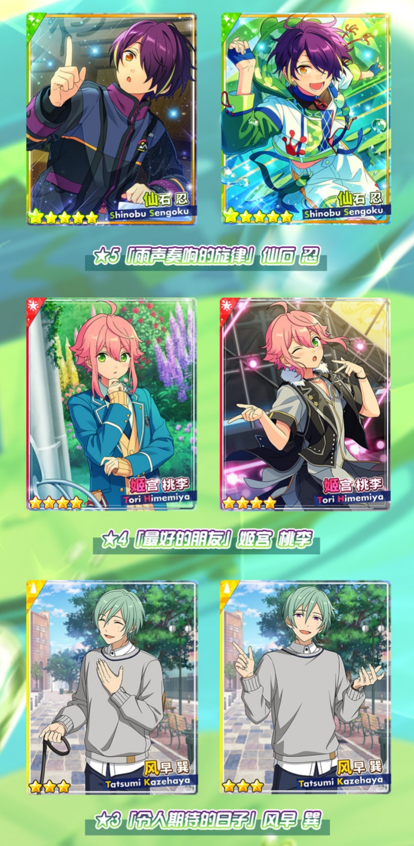 偶像梦幻祭2特别招募忍篇2已经在10月16日开放了,喜欢仙石忍的制作人们都准备好抽忍的新卡片了吗?仙石忍全新限定卡片雨声奏响的旋律不仅在心动瞬间开启动态展示功能,还有精美的服装喔,制作人们赶紧来看看特别招募忍篇2限定卡池内容吧。