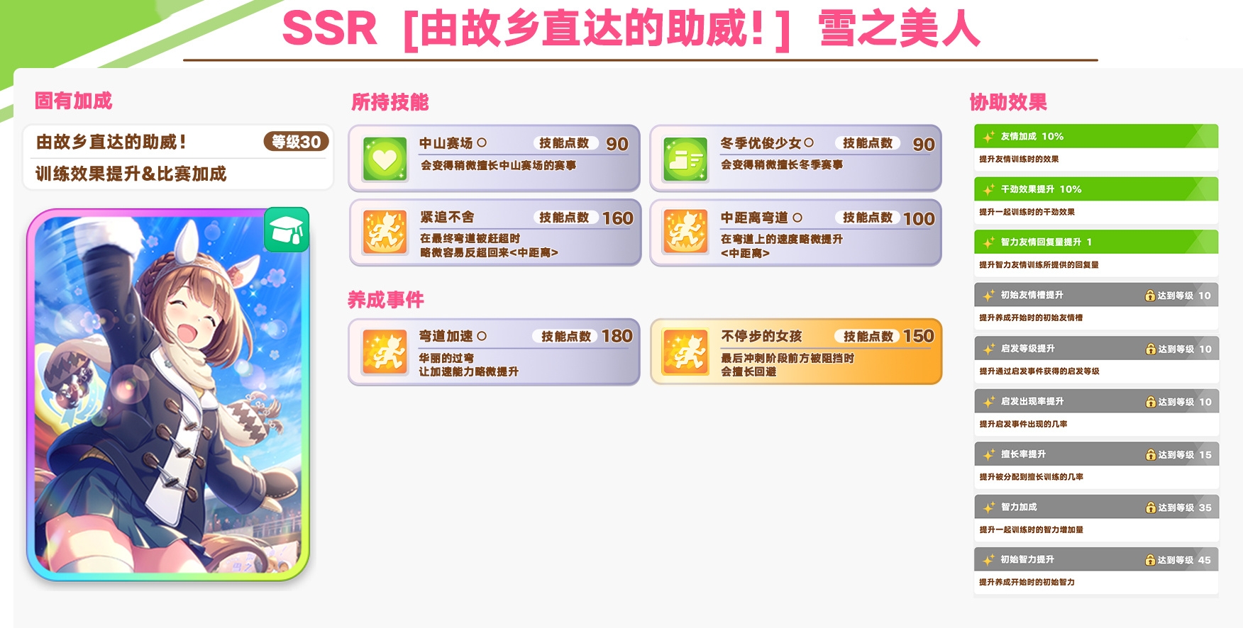 闪耀优俊少女雪之美人SSR协助卡即将在10月19日正式登场,小编已经看到不少训练员在问雪之美人SSR协助卡值得抽吗?还有本次卡池的新SR协助卡西野花这是送给你的,小编已经整理好了雪之美人与西野花协助卡的属性,训练员赶紧来参考参考吧。