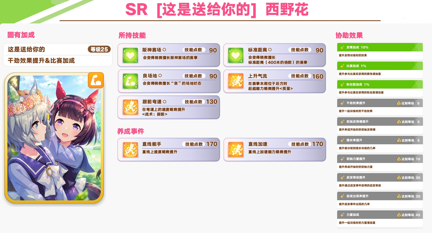 西野花是力量属性的协助卡,有需要的训练员可以考虑抽取喔~