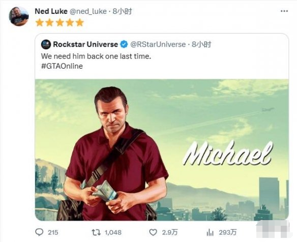 Ned Luke转发了很多此类推文,这似乎是一种暗示。有玩家猜测,R星很可能会让麦克将在《GTA Online》最终版本(最后一款DLC)中登场,也是“三男一狗”最后回归的角色。