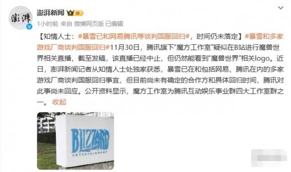 据澎湃新闻报道,有知情人士称暴雪已和网易、腾讯等多家游戏厂商谈判国服回归相关事宜,但目前未有确定的合作方和具体回归时间。
