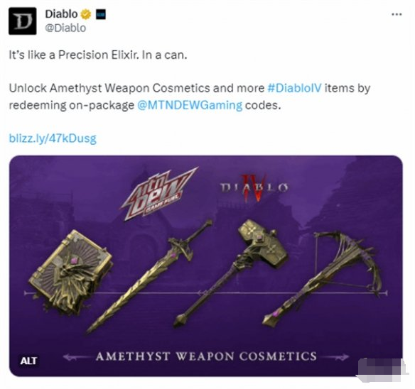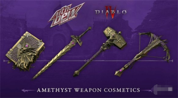 近期,《暗黑破坏神4(Diablo IV)》宣布将与激浪展开合作,共同推出全新紫色水晶幻化武器。玩家只需位于Mountain Dew Gaming的商城,利用1积分即能成功兑换。