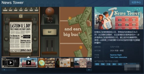 由荷兰游戏研发团队 Studio Nul Games 开发的模拟管理游戏《新闻大厦(News Tower)》现已在Steam开启封测,游戏预计将于2024年Q1开启抢先体验。