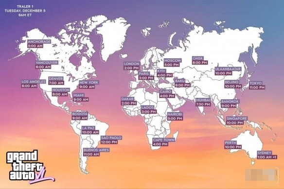 一般来说,只有游戏正式发售时,才会公布全球解锁时间图。而《GTA6》人气太高,很多玩家都迫不及待,甚至有粉丝自制了张首支预告片的全球时间解锁图,一起来看看吧!需要注意的是,左下角的LOGO并非官方图标。