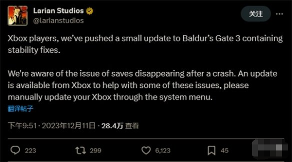 拉瑞安工作室在社交平台上发布公告称,《博德之门3(Baldur Gate 3)》Xbox Series X|S版本现已推出一项小型更新,预计将能有效解决微软主机版本游戏的存档丢失问题。